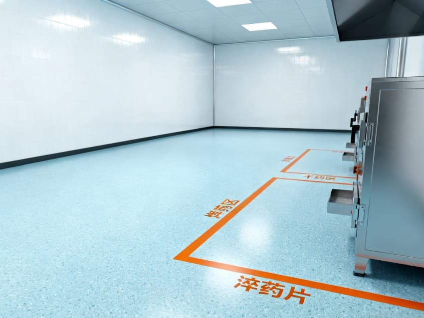 車間整體遵循醫(yī)藥級潔凈設計標準,地面采用淺藍色抗菌防滑環(huán)氧地坪,通過無縫一體化施工工藝,徹底消除藥渣殘留隱患與衛(wèi)生死角,其卓越的耐腐蝕性與易清潔特性,能夠從容應對中藥清洗、切制等高頻清潔作業(yè);四周白色防塵抗菌墻面經(jīng)過特殊工藝處理,具備優(yōu)異的光線漫反射性能,搭配頂部科學布局的柔和照明系統(tǒng),既保證操作人員能夠清晰觀察藥材炮制過程中的性狀變化,又為生產(chǎn)環(huán)境構(gòu)筑起一道潔凈無菌的安全屏障。