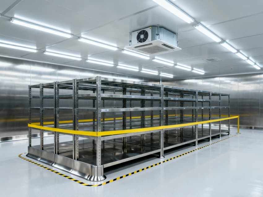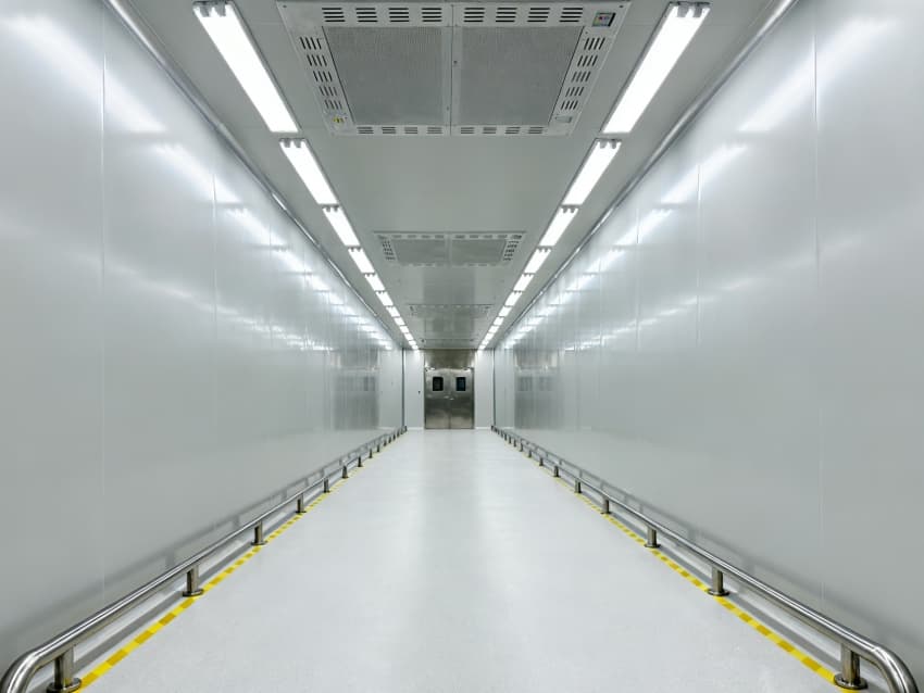 內部按芯片工藝流程劃分光刻輔助區、晶圓預處理區、封裝過渡區等,各區域通過無塵傳遞艙銜接。車間嚴格執行萬級潔凈標準(ISO8級),每立方米空氣中≥0.5μm微粒數≤352000個,采用初效-中效-高效-化學過濾四級凈化系統,配合垂直層流送風,每小時空氣置換25-30次。墻面為防靜電不銹鋼板,地面是環氧樹脂自流平材質,溫度穩定在23±1℃、濕度45±3%RH,同時配備靜電消除裝置,避免微粒與靜電影響芯片良率,完全契合芯片生產嚴苛要求。