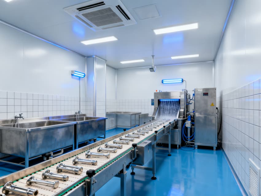 凈化配套設計全面:藍色地面具備抗菌、易消殺特性,配合地面導坡設計加速清潔排水,減少污漬殘留;白色墻面采用無縫抗菌涂層,消除清潔死角,降低微生物附著風險;全車間劃分獨立凈化分區,通過壓差控制預留設計隔絕不同潔凈等級區域,人流、物流通道分離避免交叉污染,全方位保障無菌生產環境穩定達標。