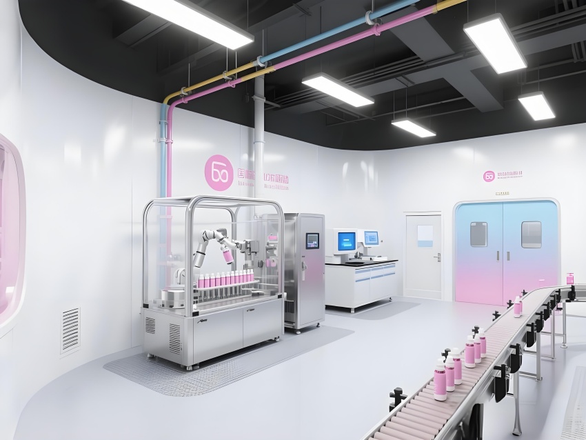 本車(chē)間以“科技感純凈美學(xué)”為設(shè)計(jì)語(yǔ)言,將化妝品行業(yè)的精致基因融入工業(yè)空間。純白主色調(diào)搭配品牌標(biāo)志性的柔光粉點(diǎn)綴,墻面圓弧過(guò)渡的彩鋼板與地面淺灰導(dǎo)靜電地板構(gòu)成潔凈基底。核心灌裝區(qū)透明層流罩內(nèi),機(jī)械臂精準(zhǔn)抓取瓶體灌裝,冷銀色設(shè)備與粉色功能標(biāo)識(shí)形成視覺(jué)對(duì)比。頂棚均勻分布的LED平板燈在乳化區(qū)投下無(wú)影光效,原料輸送管道通過(guò)色環(huán)編碼清晰區(qū)分。質(zhì)檢實(shí)驗(yàn)室的藍(lán)光檢測(cè)儀與包裝區(qū)高速傳送帶上的產(chǎn)品流,共同構(gòu)建高效生產(chǎn)韻律。人員通道的智能風(fēng)淋室采用漸變色玻璃,科技感與人性化并存。整體空間通過(guò)嚴(yán)格的功能分區(qū)與柔和的色彩管理,打造符合國(guó)際標(biāo)準(zhǔn)的化妝品智造殿堂。