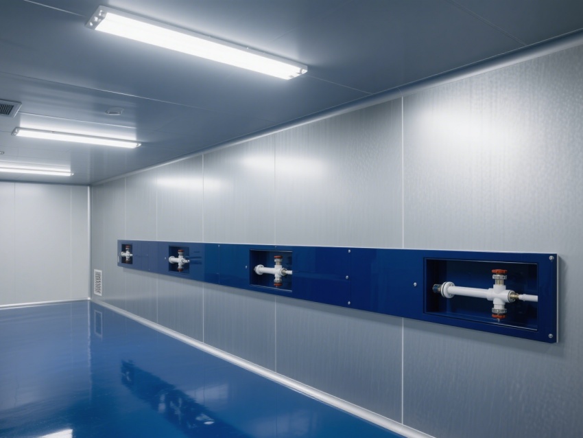 車間內部整體呈銀灰色和藍色,給人一種現代感和科技感。墻面、地面和天花板均采用無縫設計,便于清潔和消毒,防止灰塵和微粒的積聚。照明系統明亮且均勻,提供了良好的工作環境。