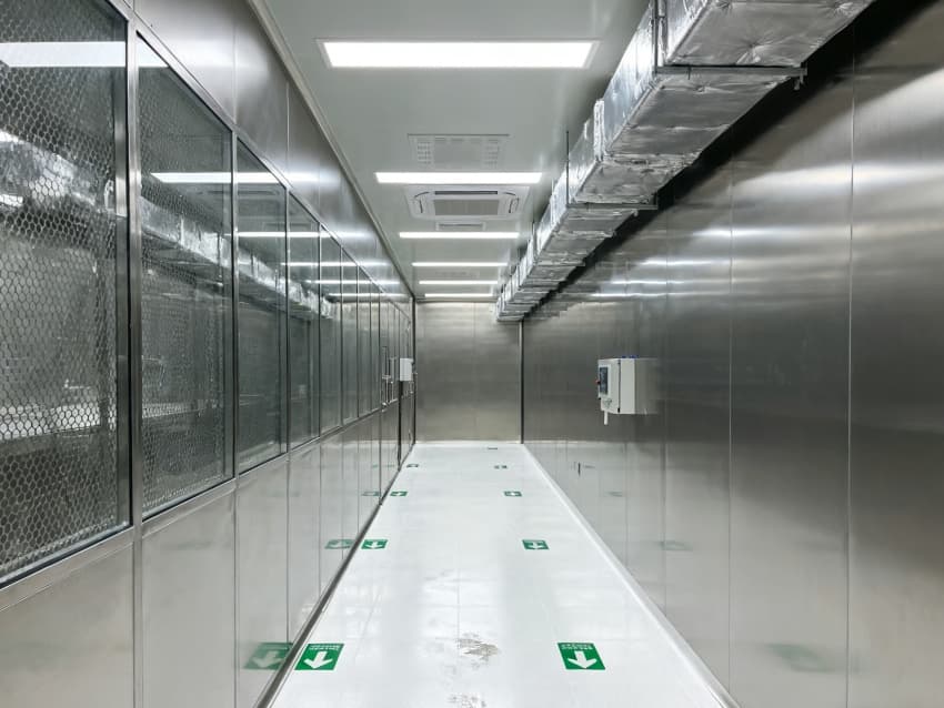本精密零件加工廠房凈化工程,風格統一契合精密加工需求。外立面采用深灰色氟碳涂層鋼板與雙層中空隔音鋼化玻璃,兼具抗磨損、抗粉塵附著與降噪性能,預留大型精密設備運輸入口與新風系統接口,滿足設備進場與環境調控的雙重需求。?