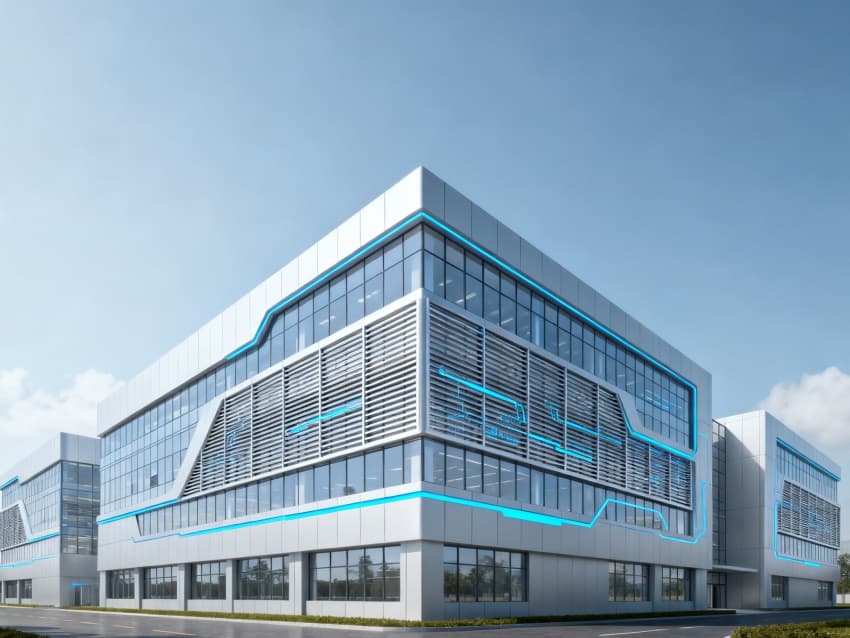 廠房外立面采用銀白啞光不銹鋼板與防眩光Low-E玻璃組合,縱向線條利落規整,主立面嵌入微縮芯片電路暗紋,既凸顯產業屬性又保持視覺簡潔;大面積玻璃幕墻搭配智能遮陽系統,可調節自然光攝入,兼顧節能與車間光照穩定性,整體呈現精密、冷靜的科技質感。?