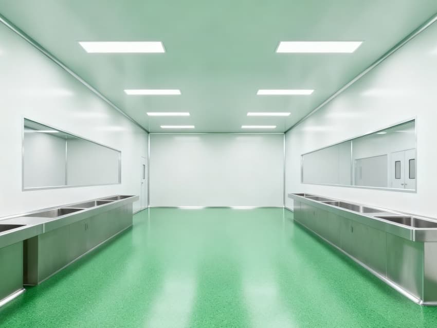 內部潔凈室以綠色防滑防污地面、白色抗菌墻壁為基礎,按生產流程劃分功能區:從正面視角可見核心配制區,預留6米柱距適配乳化罐、攪拌設備;側面視角呈現物料暫存區,設密封儲物柜避免原料污染;背面視角為灌裝預留區,保留自動化設備安裝空間;左側視角銜接質檢區,預留微生物檢測臺位置;右側視角為包裝過渡區,規劃傳送帶安裝通道;對角視角展現人員潔凈區,設風淋室與更衣間控制污染。整體空曠布局兼顧設備靈活擺放與合規要求,為安徽化妝品企業提供從原料配制到成品包裝的一體化潔凈空間,助力產業高質量發展。