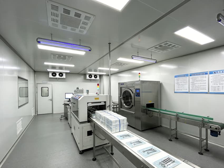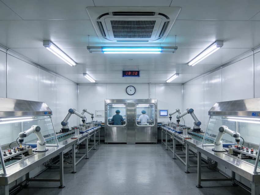 白色墻面采用食品級潔凈抗菌涂層,推行無縫拼接工藝,陰陽角采用R50圓弧倒角設(shè)計,徹底消除清潔死角,潔凈度可達(dá)Class 8級標(biāo)準(zhǔn)。車間科學(xué)劃分無菌裝配區(qū)、檢測區(qū)、物料倉儲區(qū)等功能區(qū)域,無菌區(qū)配備層流凈化預(yù)留系統(tǒng),檢測區(qū)預(yù)留精密檢測儀器安裝位與恒溫調(diào)控接口,各區(qū)域均設(shè)置獨立消殺通道與物料傳遞窗口,全方位護(hù)航醫(yī)療器械生產(chǎn)品質(zhì)。